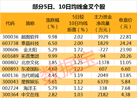 截至最新收盘,有81只A股的5日均线主动上穿10日均线,其中超图软件、泰晶科技、金太阳等个股的5日均线较10日均线距离最大,分别达2.02%、2%、1.72%。