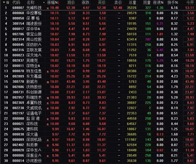 今日A股开盘,深圳本地股集体暴涨!截至发稿,约30只股票涨停,深圳机场、盐田港、深天地A、深物业A等股票涨停,招商港口、中集集团、深康佳A等股票涨幅居前,深圳板块的集体暴涨,也带动了沪深指数高开。据统计,截止发稿,深圳本地概念A股总市值大涨1500亿!
