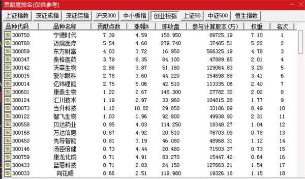 从表现最强的创业板指情况来看,截至午间收盘,对创业板指贡献度居前的个股为宁德时代、迈瑞医疗、东方财富、泰格医药、沃森生物,可以看到创业板指的上涨主要由部分权重占比较高的股票推动。对创业板贡献度前十的个股合计贡献点数达32.69点,而创业板指上涨点数为44.69点。