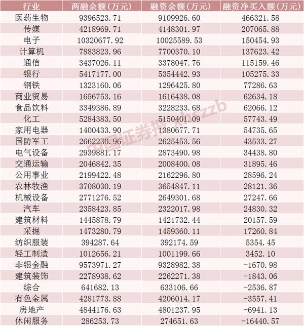 从本周前4个交易日融资余额增加近200亿元的情况来看,医药生物、传媒、电子融资余额增加额居前,分别增加46.63亿元、20.71亿元、15.05亿元,仅有休闲服务行业融资余额减少超过1亿元,为1.64亿元。