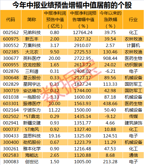 以净利增幅中值计算,590只个股上半年业绩预增,其中净利润预告中值同比翻番以上的有262只,21股中报预告净利增幅超10倍。兄弟科技预告净利增幅中值高达12764.24%,增幅上限高达143倍;其他增幅中值较高的还有新五丰、万集科技、大北农、英科医疗、欣龙控股、三利谱、星云股份等,净利预告增幅中值都超过20倍。