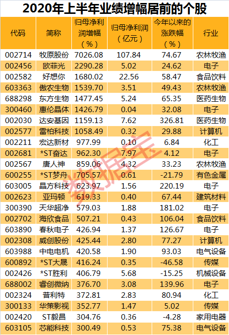 统计发现,上半年涨幅居前个股中,与食品相关的个股较多,比如牧原股份、傲农生物、唐人神、海欣食品等。疫情影响了食品消费行业格局,猪肉、方便食品等受益于宅经济带来的价格、销量增长,使得相关上市公司今年的业绩表现大幅领先于市场平均水平。