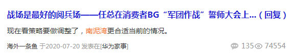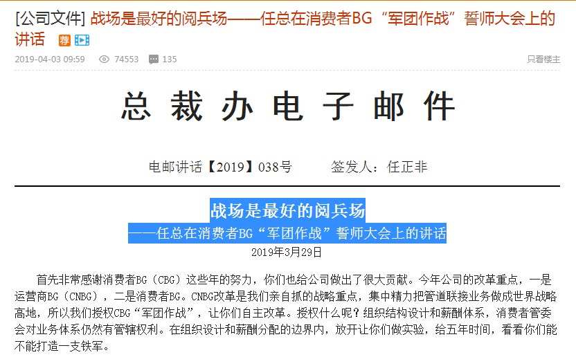 除上述信息外,证券时报·e公司记者还在华为心声社区发现了一份名为“战场是最好的阅兵场——任总在消费者BG“军团作战”誓师大会上的讲话”的文件,该文件发表于2019年3月29日,即华为被美国列入实体清单之前。