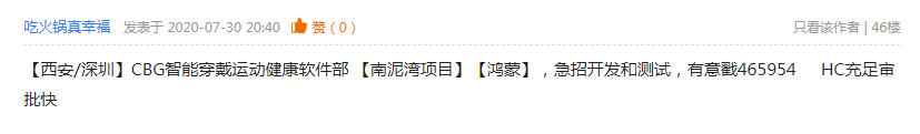 另外,记者注意到,2020年7月30日,心声社区内有一个名为“吃火锅真幸福”的发帖人,在心声社区多篇帖子后跟贴,具体内容为:【西安/深圳】CBG智能穿戴运动健康软件部 【南泥湾项目】【鸿蒙】,急招开发和测试,有意戳465954, HC充足审批快。