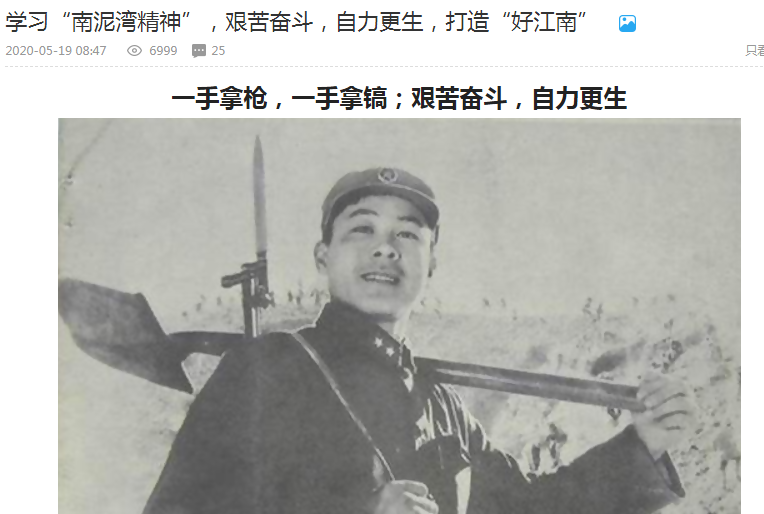 其中第一条便是学习南泥湾精神的帖子。主题为,学习“南泥湾精神”,艰苦奋斗,自力更生,打造“好江南”,一手拿枪,一手拿镐;艰苦奋斗,自力更生。该帖发布时间为2020年5月19日。