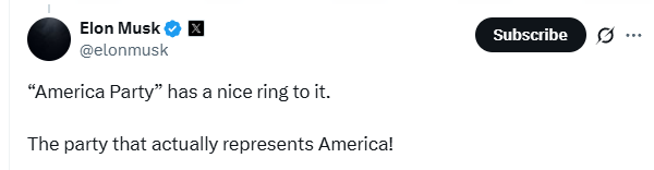 调查结果显示,超过80%的投票者都选择“是”。马斯克于6日晚间发文称:“这是命运。”随后,马斯克还表示赞同一位粉丝提出的党名建议——“美国党”(America Party)。