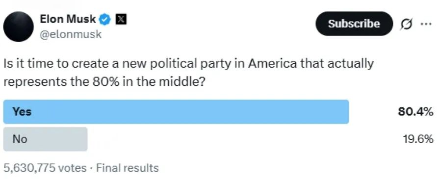 据了解,马斯克于5日首次提出这一想法。他在社交平台X上向2.2亿粉丝发起投票,询问是否同意“是时候在美国创建一个真正代表80%中间派的新政党了”。
