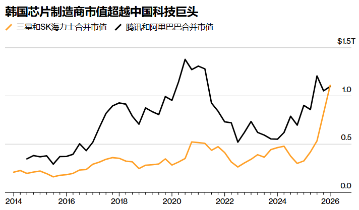 韩国市值最高的两家公司即将首次超越中国两家互联网巨头,这凸显了不断发展的全球人工智能热潮重塑了亚洲科技股的投资格局。周二交易期间,三星电子和SK海力士的合并市值达到1.11万亿美元,略微超过了阿里巴巴和腾讯(两家在香港上市的最大的中国科技公司)的合并市值。