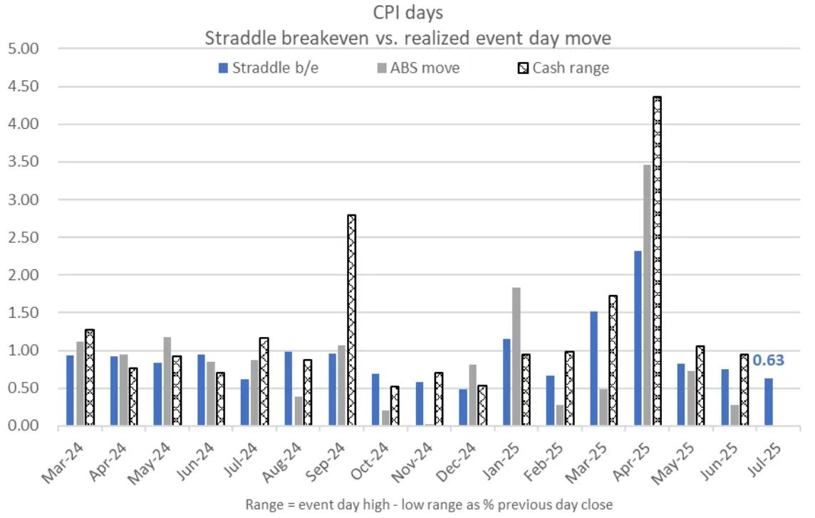 花旗集团汇编数据显示,期权市场的押注显示交易员预计标普500指数将在今晚公布的6月CPI数据后波动0.6%,这与前两次低于预期的CPI公布日市场波动幅度基本持平,但远低于过去一年此类数据公布日平均0.9%的实际波动幅度。