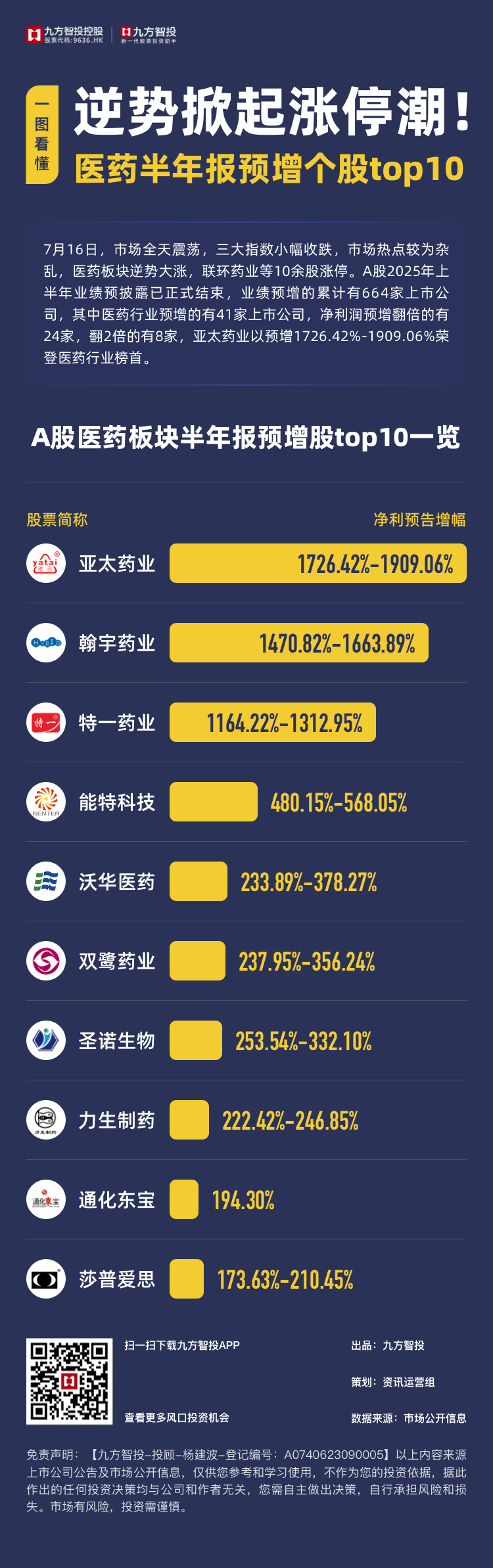 逆势涨停潮!一图看懂医药半年报倍增个股名单