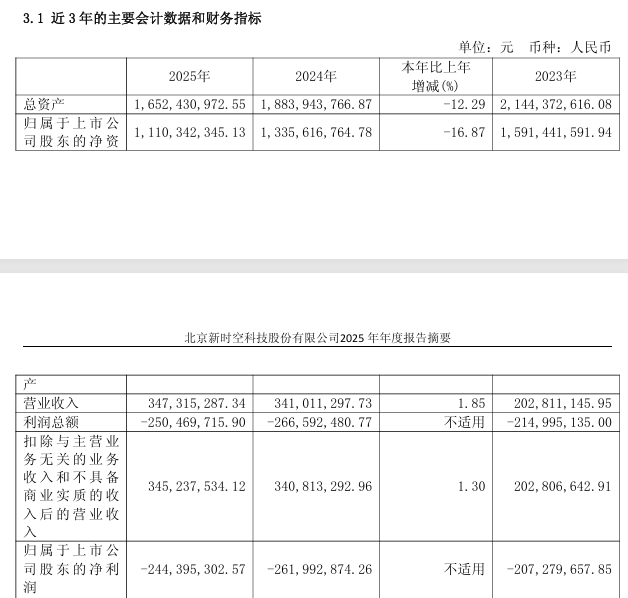 同日,时空科技披露了2025年年度报告。报告期内,公司实现营业收入3.47亿元,同比增长1.85%;归属于上市公司股东的净利润为亏损2.44亿元。