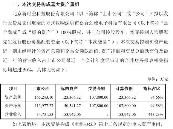 时空科技(605178)4月17日晚间公告,公司拟通过发行股份及支付现金的方式向张丽丽、陈晖等19名交易对方购买深圳市嘉合劲威电子科技有限公司(简称“嘉合劲威”)100%股份,并向公司控股股东、实际控制人宫殿海发行股份募集配套资金。本次交易构成重大资产重组,交易价格为10.78亿元。