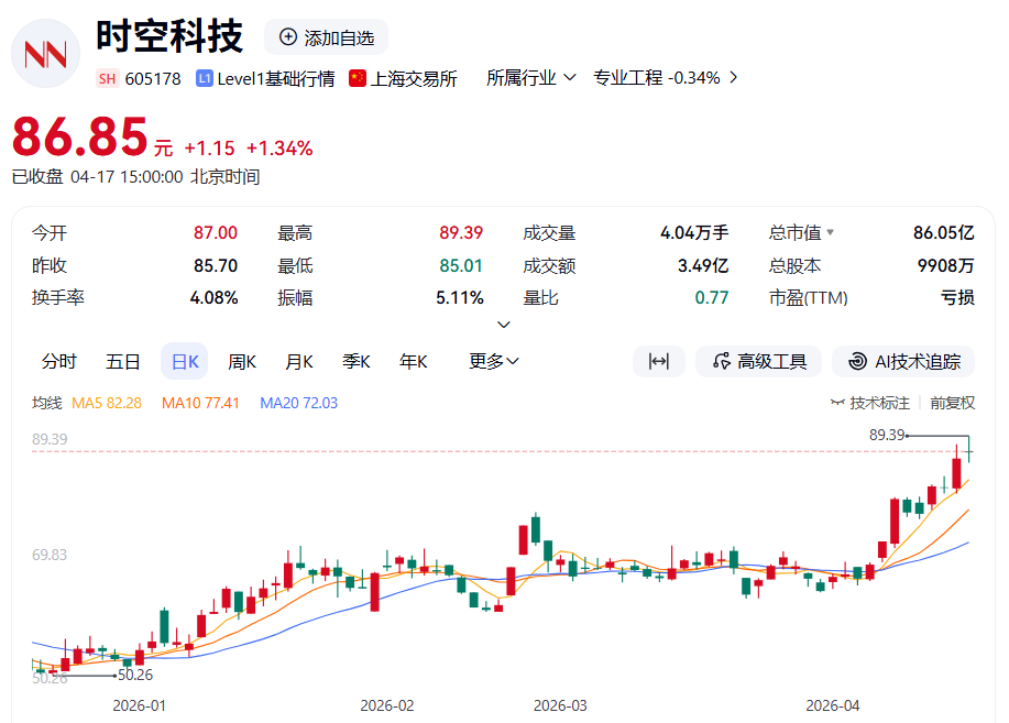 二级市场上,时空科技4月17日收报86.85元/股,总市值为86.05亿元。