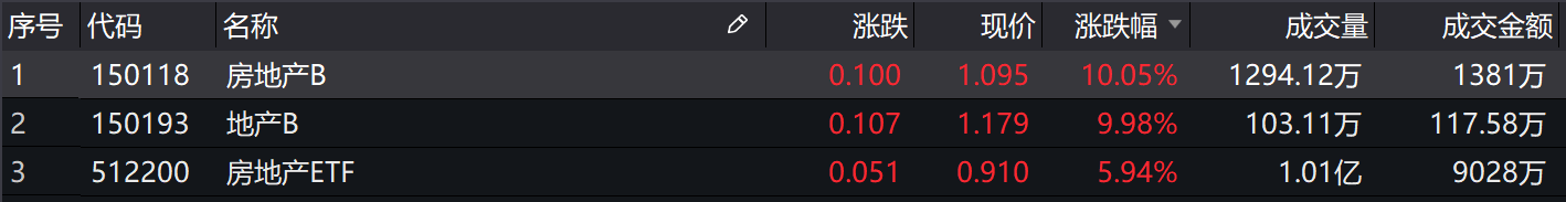 除此之外,沉寂多日的地产股表现强势,板块内多只个股涨停,场内房地产主题基金同样表现强势,房地产B(150118.SZ)、地产B涨停,房地产ETF涨幅近6%。