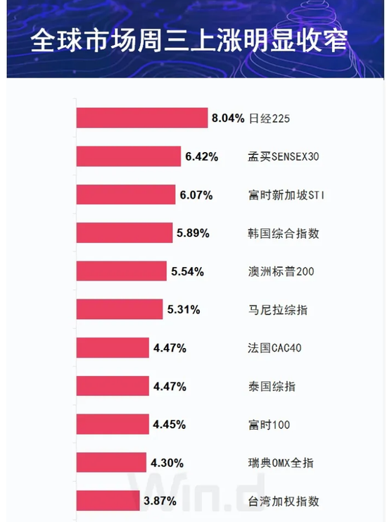 北京时间周三白天,亚太市场较火热,日经225大涨8.04%收盘,韩国综合指数涨5.89%,中国香港恒生指数拉升3.81%,而A股因近期一直强劲抗跌,因此反弹幅度相比日韩要小,但也不差,沪深两大股指分别涨2.17%和3.22%。