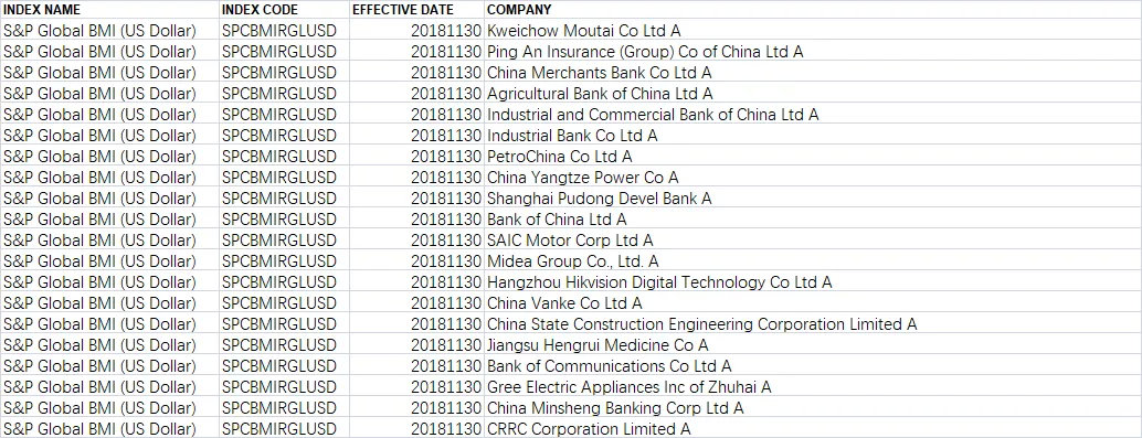 标普道琼斯全球股票指数高级总监Michael Orzano在9月5日晚间接受中国证券报记者采访时表示,9月6日美股收市后(北京时间9月7日凌晨4点后),标普道琼斯指数将公布纳入A股的具体名单。根据此前发布的新闻稿,此次将有1241只A股被纳入标普道琼斯的6大指数家族,下图为标普道琼斯在2018年12月公布的纳入A股名单(部分)。