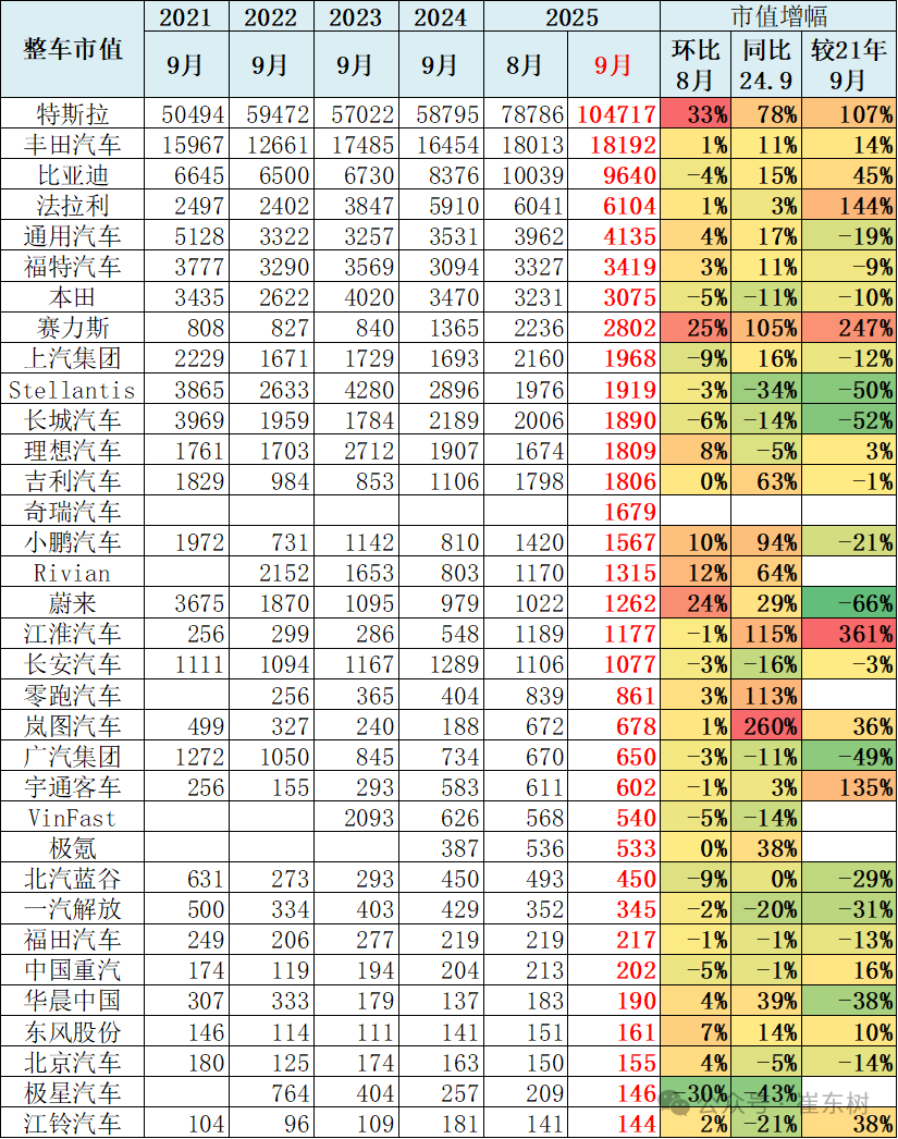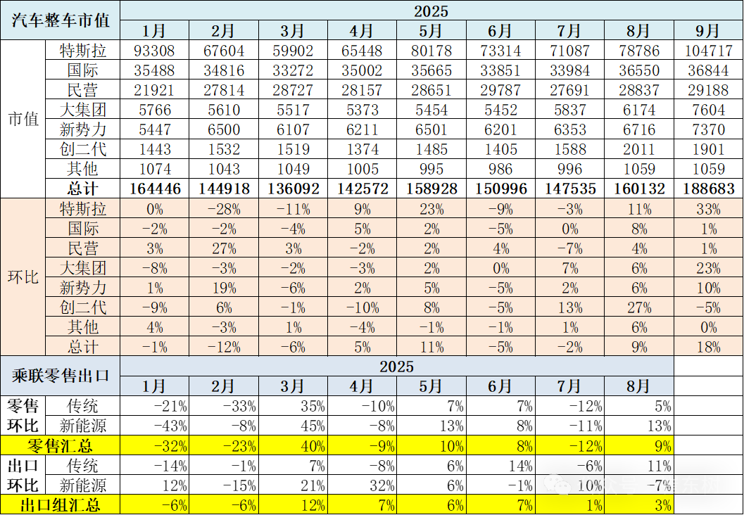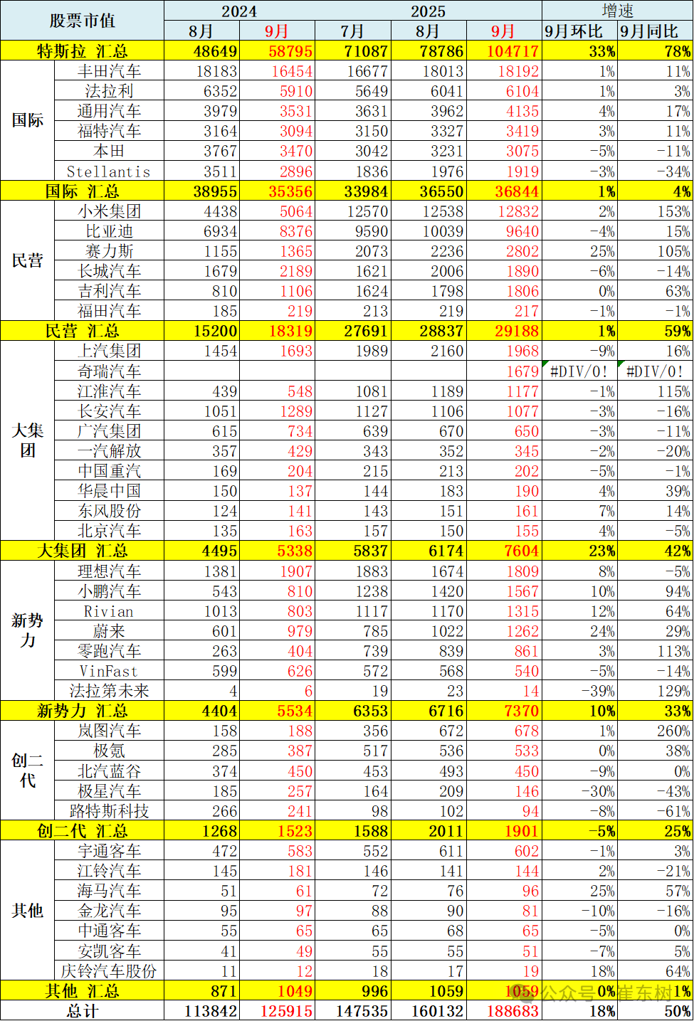 10月5日,崔东树发文称,汽车整车上市公司市值不仅是资本市场对企业当前经营成果的定价,更是反映汽车行业趋势、技术变革与政策导向的“晴雨表”。很多整车企业都把市值管理作为重要的工作,因此跟踪市值变化也是行业研究的重要领域。9月的整车市值变化依旧延续新能源为核心增长动力的体现,但燃油车企稳带来的市值改善也是很好的趋势。国际车企的市值分化,美股的大部分国际公司表现较一般,港股的内资企业表现优秀。