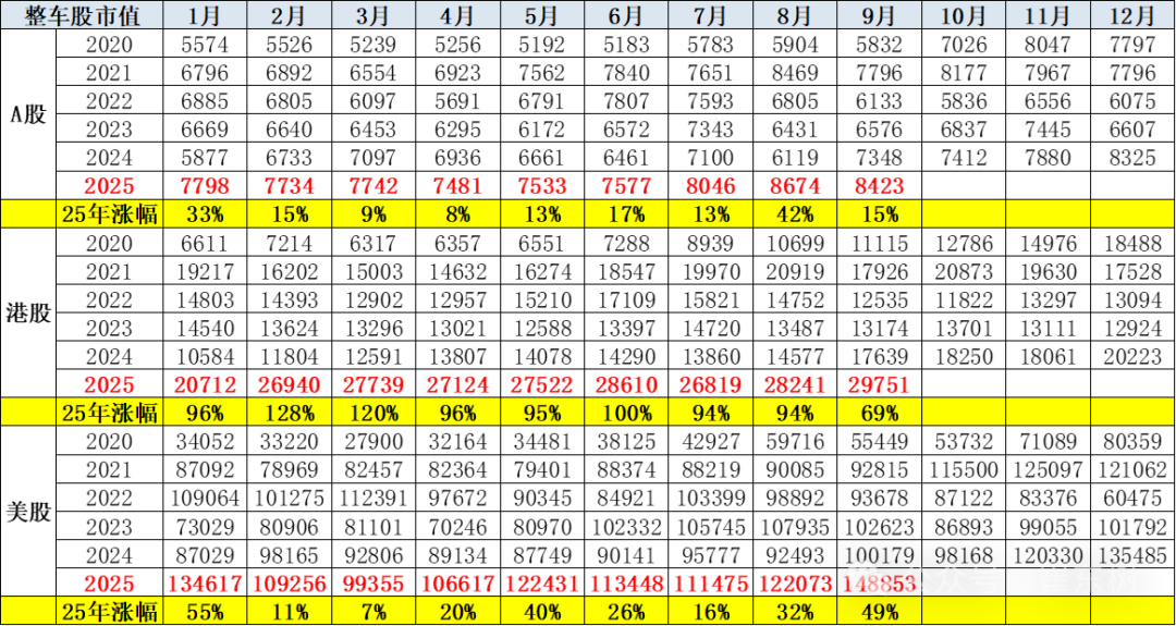 汽车整车类上市公司主要是在美国股票市场和香港股票市场,以及国内A股市场三大市场进行研究。欧洲市场由于相对比较分散,暂时不做研究。世界整车企业市值中,美股市场的规模最大,2025年9月份达到14.8万亿元的规模,而港股市场也达到了3万亿元的规模,国内A股市场达到8400亿元的规模,在这里我们把A股港股中有些多地上市的公司市值会按第一上市地做侧重,A股相对来说比较简单一点。