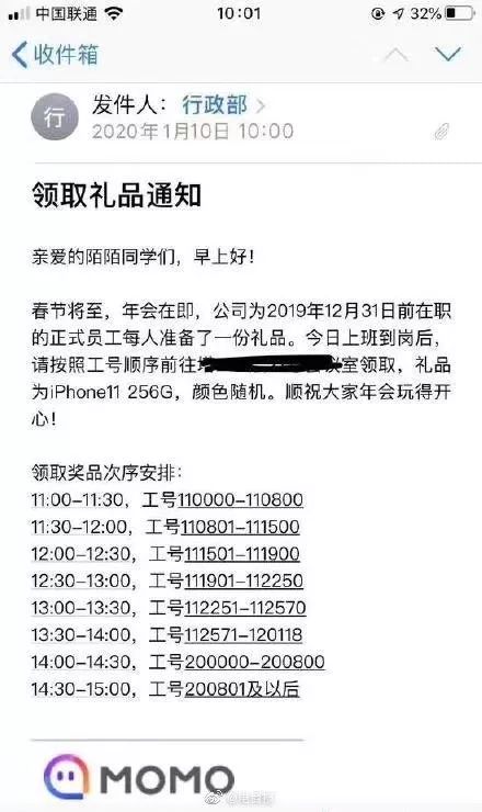有网友在微博上晒出陌陌的公司邮件截图,截图内容显示在2019年12月31日前就职的正式员工,可以获得iPhone 11作为年终奖。而且,陌陌为员工准备的是256GB顶配版的iPhone 11,市场价为6799元。