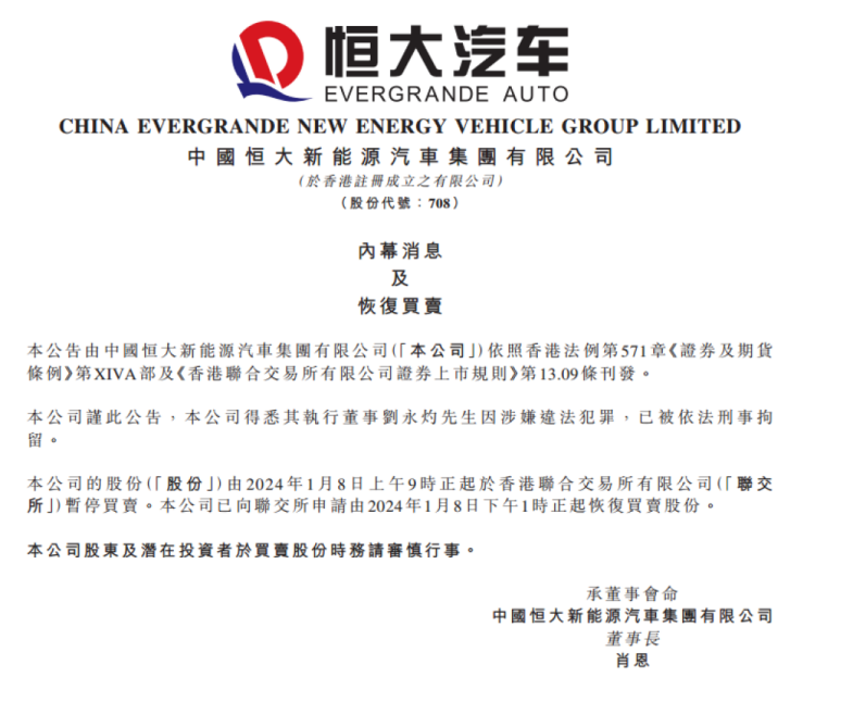 恒大汽车午间发布公告,公司执行董事刘永灼因涉嫌违法犯罪,被依法刑事拘留。