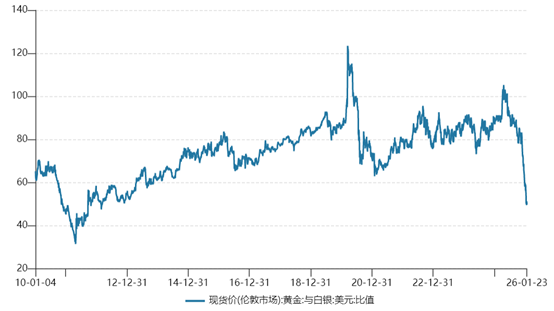 2025年全年,白银价格已上涨了近150%。由于涨幅大大超过了黄金,金银比持续下降,目前,金银比已跌破了50,远离了60-70的长期震荡区间,创近14年来新低。