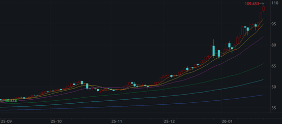 在黄金历史性的站上5000美元/盎司的同时,白银以更猛烈的涨势创造着新高。北京时间今晨,国际白银现货价格首次站上100美元/盎司,最高时已接近110美元。