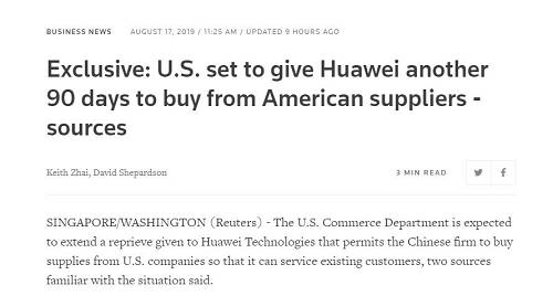 据路透社和《华尔街日报》报道,据两位消息人士透露,美国商务部预计将延长华为公司(Huawei Technologies)的暂缓期,并允许华为从美国公司购买供应品,以便为现有客户提供服务。