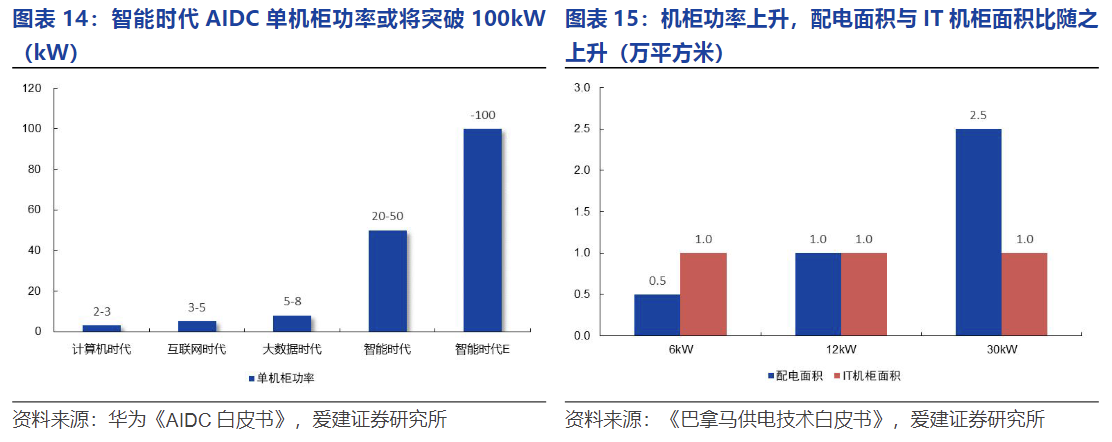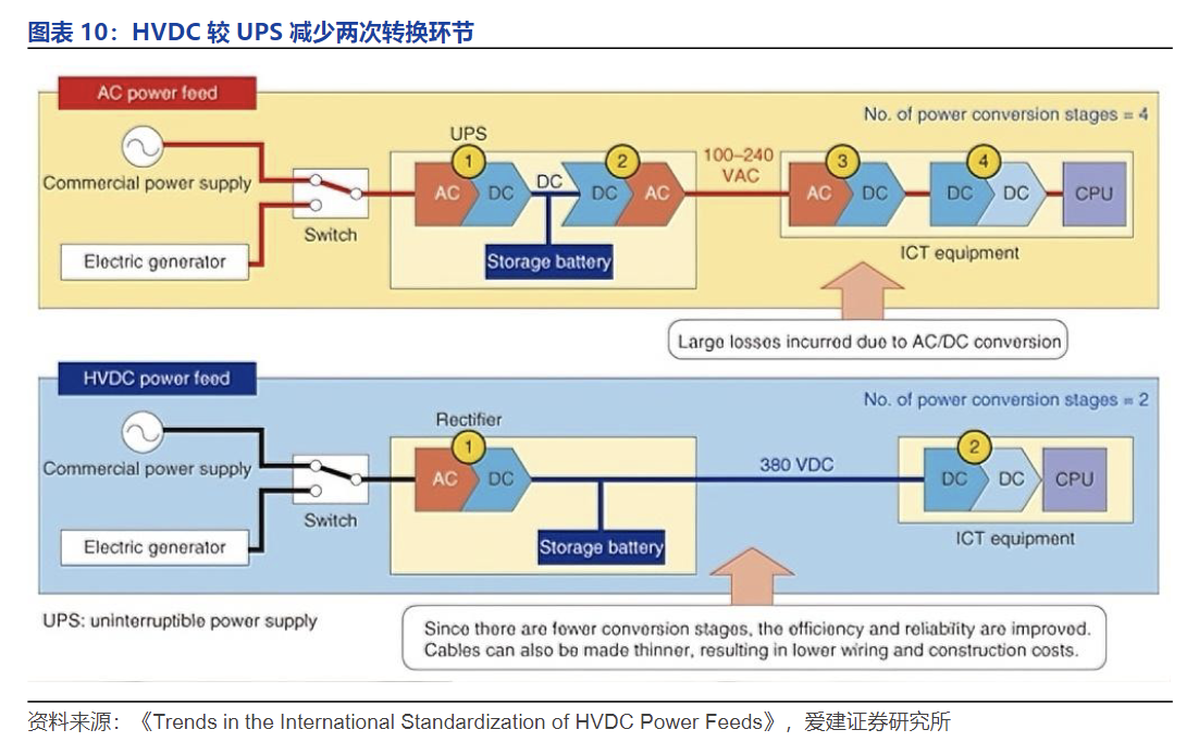 HVDC推广缓慢主要受早期低功率经济性不足与交流生态(无高压标准)双重制约。在单机柜功率提升趋势下,促进HVDC渗透率加速提升。AI数据中心单机柜功率密度向100kW跃升,高压方案成为必然选择,HVDC渗透率迎来加速提升的契机,其优势在高密度、高功耗场景下被显著放大:1)空间价值凸显,机柜功率从6kW增至30kW时,配电房与机房面积比由0.5:1升至2.5:1,HVDC系统结构更为紧凑,有助于提升空间利用率;2)能效优势被放大,随着摩尔定律趋近瓶颈,算力提升依赖功耗同步增长,高功率机柜的电力成本急剧上升,HVDC的能效优势能显著降低运营。