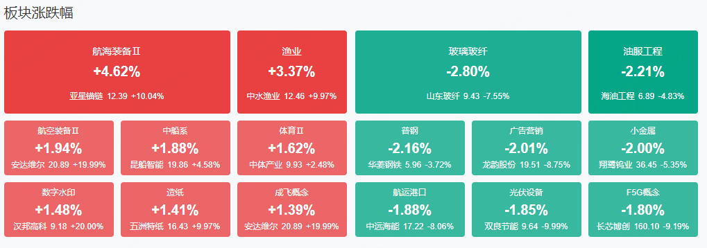 市场早盘震荡调整,三大指数集体下挫,创业板指领跌,黄白二线明显分化。量能大幅萎缩,沪深两市半日成交额1.2万亿,较上个交易日缩量1256亿。盘面上热点快速轮动,全市场超2600只下跌。从板块来看,军工板块涨幅居前,亚星锚链封涨停。半导体板块表现活跃,光刻机、光刻胶概念快速拉升,国风新材4天2板。半导体设备概念持续走强,圣晖集成反包涨停续创历史新高。造纸概念反复走强,五洲特纸风涨停。下跌方面,港口航运概念集体下挫,中远海能、招商轮船大跌。