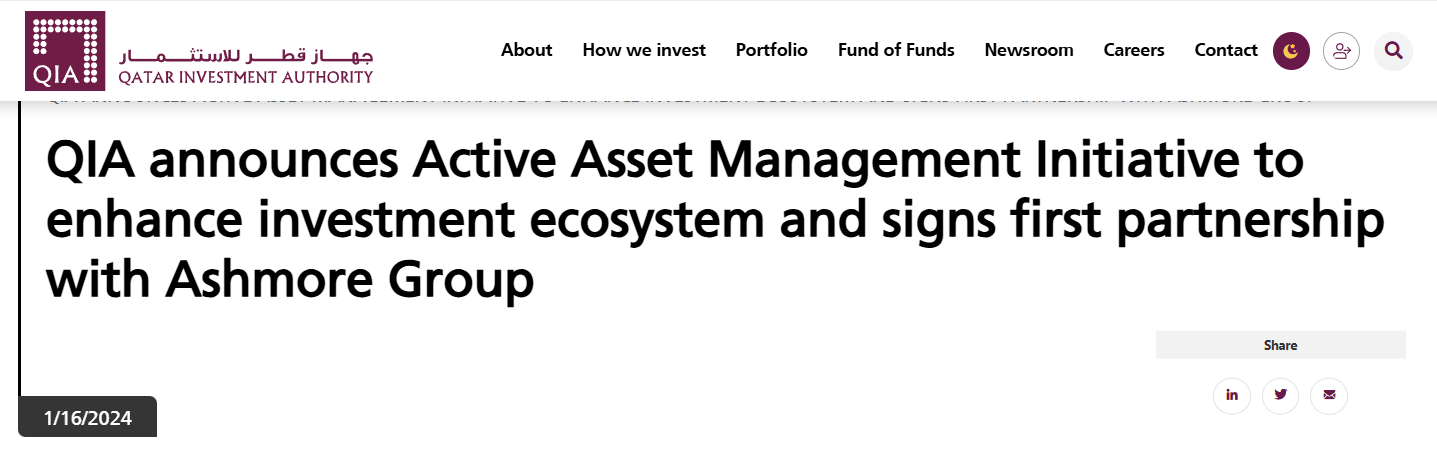同时,QIA宣布与专注新兴市场的资管机构Ashmore Group合作,推出规模为2亿美元的基金“Ashmore卡塔尔股票基金”,同样投资于卡塔尔本地股票。Ashmore已于今年5月在多哈设立办公室。