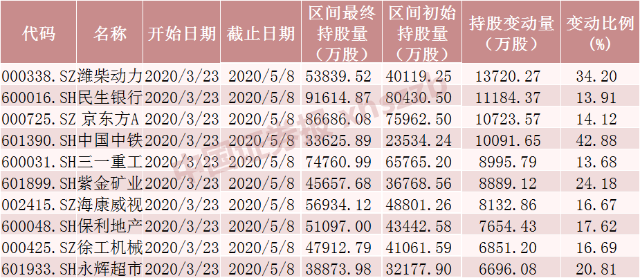 Choice数据显示,3月24日以来,北向资金共计加仓824只个股,对其中122只个股的加仓股数超过1000万股。加仓股数居前的个股为潍柴动力、民生银行、京东方A、中国中铁、三一重工、紫金矿业、海康威视,加仓股数分别为1.37亿股、1.12股、1.07亿股、1.01亿股、0.90亿股、0.89亿股、0.81亿股。从加仓股份数居前的个股来看,北向资金对蓝筹股大幅加仓。