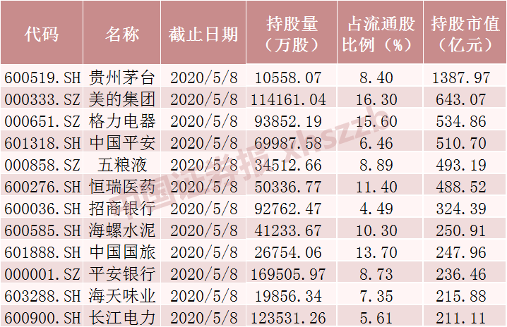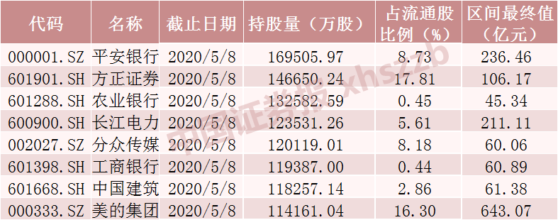 在个股持股方面,Choice数据显示,截至5月8日,北向资金对平安银行、方正证券、农业银行、长江电力、分众传媒、工商银行、中国建筑、美的集团的持股量超过10亿股。