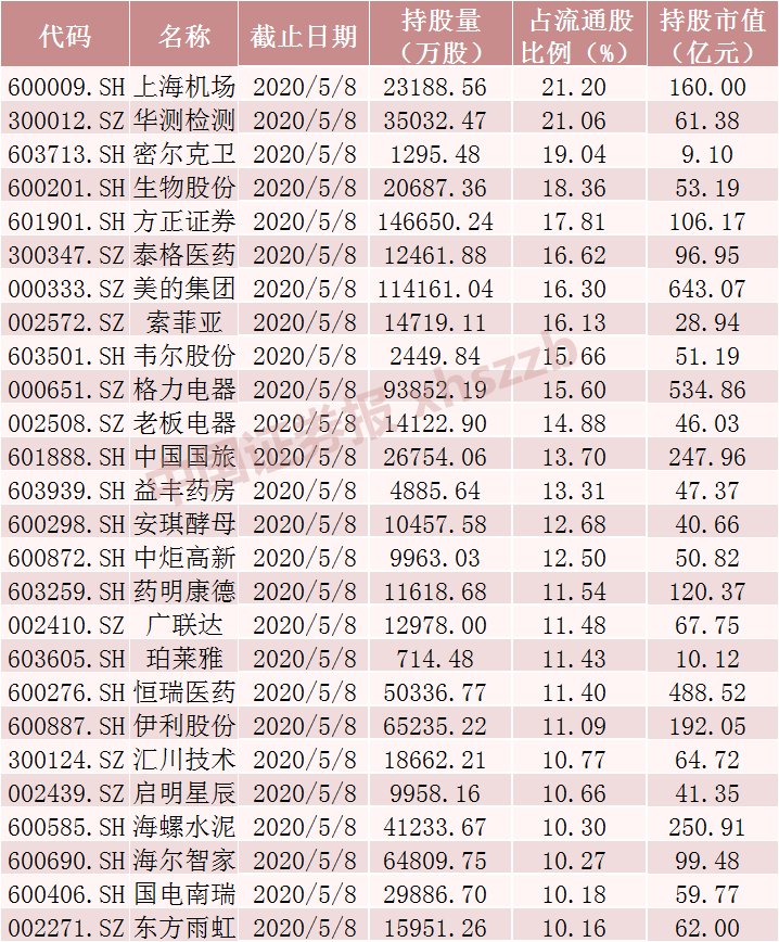 对上海机场、华测检测、密尔克卫、生物股份、方正证券、泰格医药等26只个股的持有流通股比例超过10%。