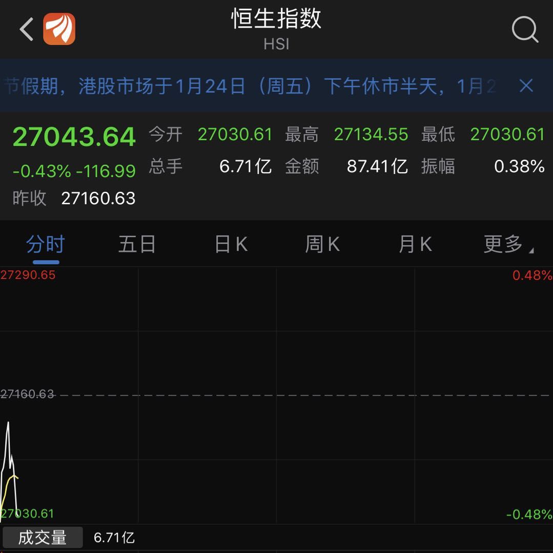 1月30日,香港股市开盘继续杀跌,但跌幅不是太大。恒生指数开盘下跌0.48%,报27030.61点;恒生国企指数开盘下跌0.55%,报10560.61点;恒生红筹指数开盘下跌0.85%,报4244.70点。