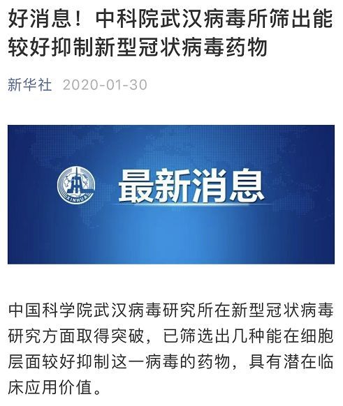 这是新华社记者29日从中科院武汉病毒所获得的消息。据该所相关负责人介绍,筛选结果已向国家和湖北省新型冠状病毒感染的肺炎疫情防控指挥部科技攻关组报告,供综合研判后指导医疗救治。