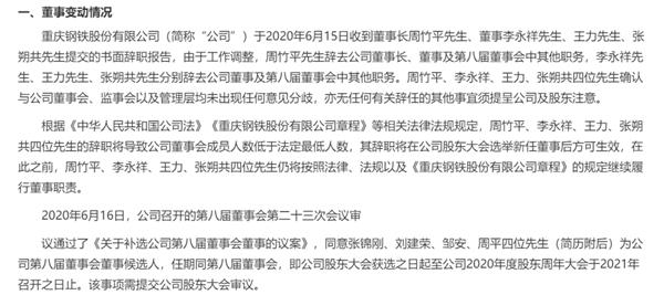 6月16日晚间,重庆钢铁发布公告,由于工作调整,周竹平辞去公司董事长、董事及第八届董事会中其他职务,李永祥、王力、张朔共分别辞去公司董事及第八届董事会中其他职务。
