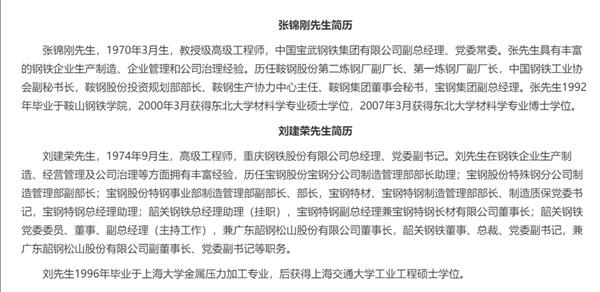 公告显示,张锦刚等全部来自中国宝武,张锦刚为中国宝武副总经理,党委常委。