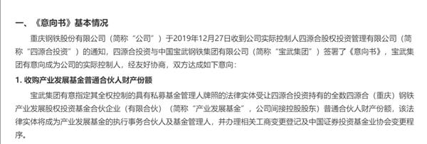 2019年12月27日晚间,重庆钢铁发布公告,公司于2019年12月27日收到公司实际控制人四源合股权投资管理有限公司(下称“四源合投资”)的通知,四源合投资与中国宝武签署了《意向书》,中国宝武有意向成为公司的实际控制人。
