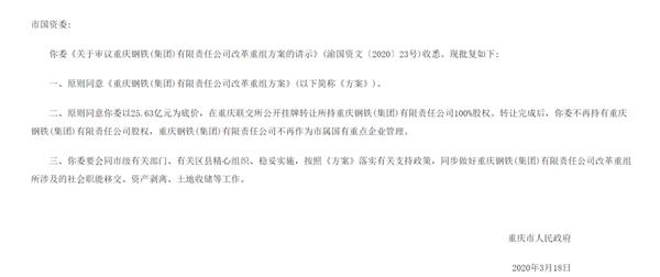 2020年3月20日,重庆市人民政府发布关于重庆钢铁(集团)有限责任公司改革重组方案的批复,同意重庆市国资委以25.63亿元为底价,公开挂牌转让所持有的重庆钢铁(集团)有限责任公司100%股权。按照《方案》落实有关支持政策,重庆市国资委将同步做好重庆钢铁(集团)有限责任公司改革重组所涉及的社会职能移交、资产剥离、土地收储等工作。