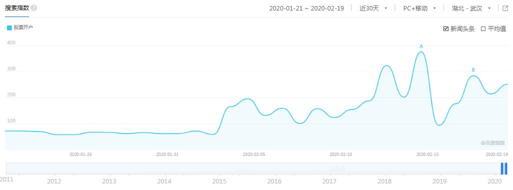 与此相印证,在单独查询武汉市“股票开户”搜索趋势时,发现自2月12日起,搜索人次便一直在高位震荡,2月14日达到最高峰,而这一天刚好落在2月12日-2月19日区间内。