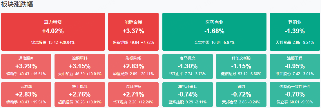 板块方面,算力产业链、锂电产业链、影视院线等板块表现活跃,医药商业、油气石化、猪肉等板块表现落后。截至收盘,沪指涨0.53%,深成指涨1.69%,创业板指涨2.66%。