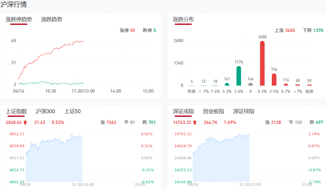 市场早盘震荡反弹,创业板指涨超2%,再度刷新十年新高。黄白线分化明显,权重股走势较强,宁德时代盘中连续反超中国石油、工商银行跃居A股总市值第二。沪深两市半日成交额1.46万亿,较上个交易日缩量1222亿。盘面上热点快速轮动,全市场超3800只个股上涨。从板块来看,算力租赁概念持续走强,宏景科技涨超19%续创历史新高,利通电子3连板,美利云、奥瑞德、恒润股份涨停。电池产业链集体爆发,宁德时代续创历史新高,大中矿业4天2板,金圆股份、龙蟠科技、科达利涨停。算力硬件概念反复活跃,天孚通信涨超8%,特发信息触及涨停。下跌方面,医药板块震荡调整,信立泰触及跌停,津药药业、联环药业、广生堂纷纷下挫。