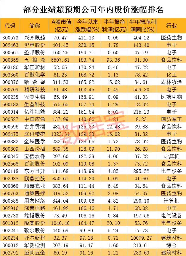 超预期的业绩带来上市公司股价的同步上涨。数据显示,上述212家业绩超预期公司年内股价平均涨幅为51.56%,是同期沪指涨幅的近3倍。26家公司年内股价累计涨幅翻倍,这些股票主要集中在大消费板块,其中尤以电子行业公司居多,如主营印刷电路板的沪电股份,主营集成电路芯片的圣邦股份,主营环氧树脂覆铜板的华正新材,主营MIM核心零部件的精研科技,主营高端电子材料的生益科技等。