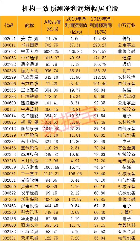 在上述212家业绩超预期公司中,根据10家以上机构一致预测数据,37家公司2019年度净利润一致预测增幅超过50%。机构一致预测净利润增幅最高的是美吉姆,预测今年净利润增幅达425.43%。