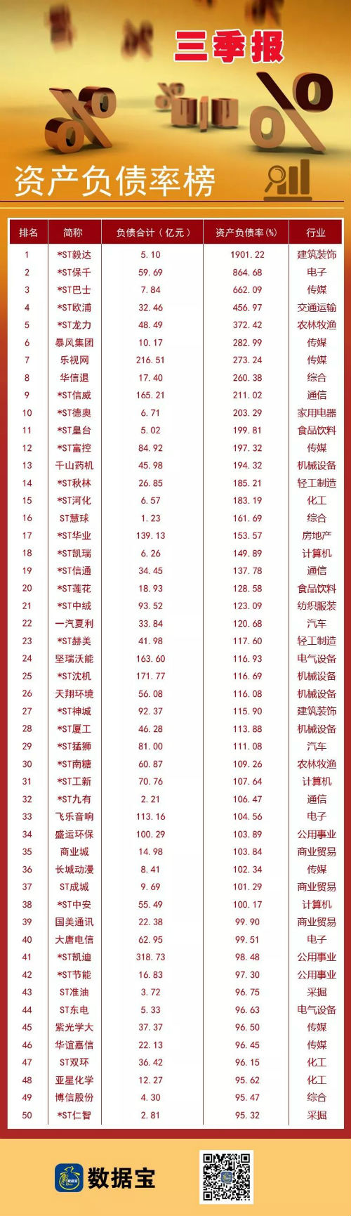 数据宝与中国上市公司研究院联合发布的《A股上市公司资产负债率榜(非金融)》显示,上榜的100家公司资产负债率均超过85%,较去年同期进入前100的门槛提升了2个百分点。其中,ST股接近半数,多达46家。