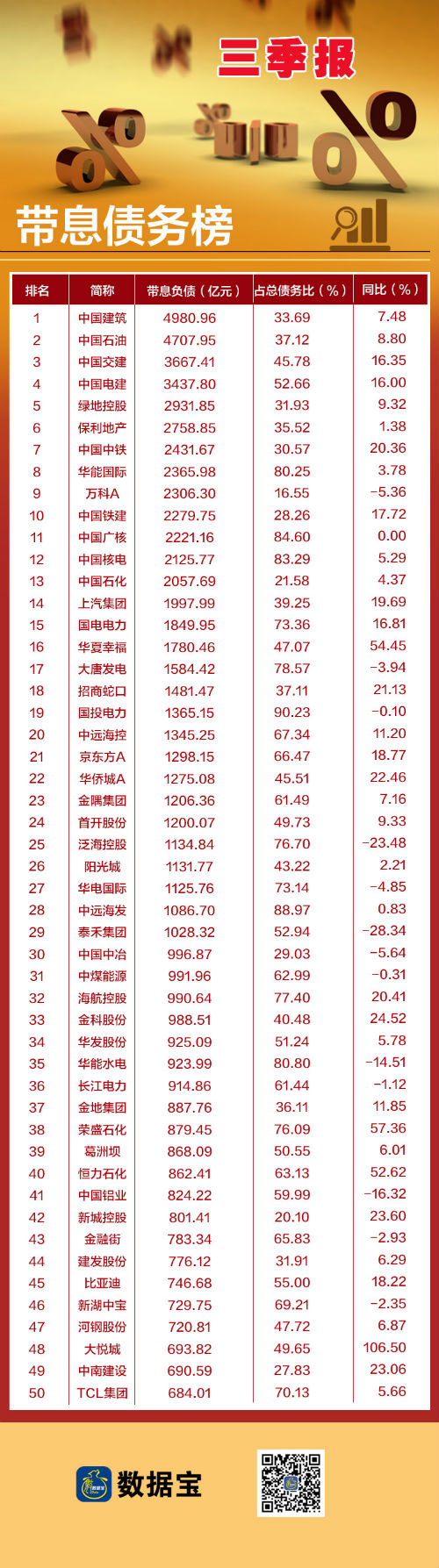 数据宝与中国上市公司研究院联合发布《A股上市公司带息债务榜(非金融)》,进入榜单的100家公司带息负债占全部上市公司比例超55%,最低的是雅戈尔(319.27亿元),而去年同期门槛不足300亿元。位居榜单前三的中国建筑、中国石油及中国交建带息负债均超过3500亿元。上海电气及中兴通讯分别是电气设备行业及通信行业唯一上榜公司,分别位居榜单第68位、79位。