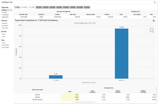 市场已经基本消化了9月降息的可能性。据CME“美联储观察”,目前美联储9月降息25个基点的概率高达93.8%,降息50个基点的概率为6.2%,而维持利率不变的概率已经降至零。