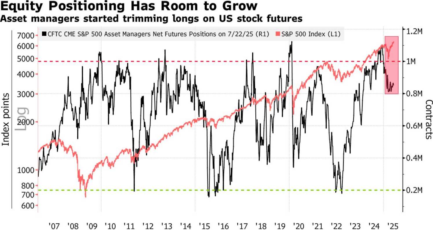 在美联储利率决议之前,全球股票市场的整体敞口稳步上升但并未显现狂热迹象。德意志银行的策略师们表示,资产管理机构们对于标普 500指数的期货持仓保持在多头水平,但并未达到极端,总体风险敞口仅“温和超配”。
