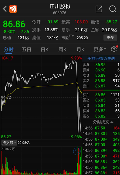 相比上述个股的全天弱势,正川股份的高位跳水令人心惊。行情数据显示,14点40分左右,该股一度涨逾8%。仅仅6分钟左右时间,该股即从高位跳水,一度逼近跌停。以期间最低价计算,该股在短短6分钟时间即跌逾16%。