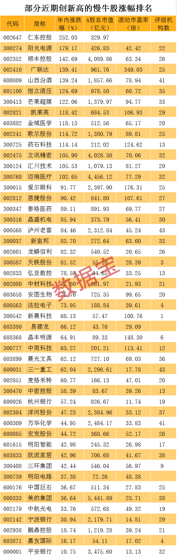 值得注意的是,榜单中只有仁东控股、明阳电路、易德龙等3只个股无一机构评级。仁东控股今年股价大涨超252%,是榜单涨幅最大的个股。从月线来看,该股已经月线十连阳,并且是连续10个月月度股价上涨。